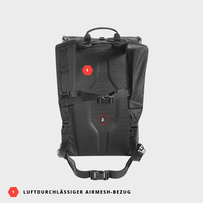 Der thermogeformte Rücken mit luftdurchlässigem AirMesh-Bezug (1) schmiegt sich kraftschlüssig an den Rücken. Ein mittiger Belüftungskanal (2) sorgt für angenehme Luftzirkulation. Durch die Verwendung des leichten, technischen Schaums wird zudem Rucksackgewicht eingespart.