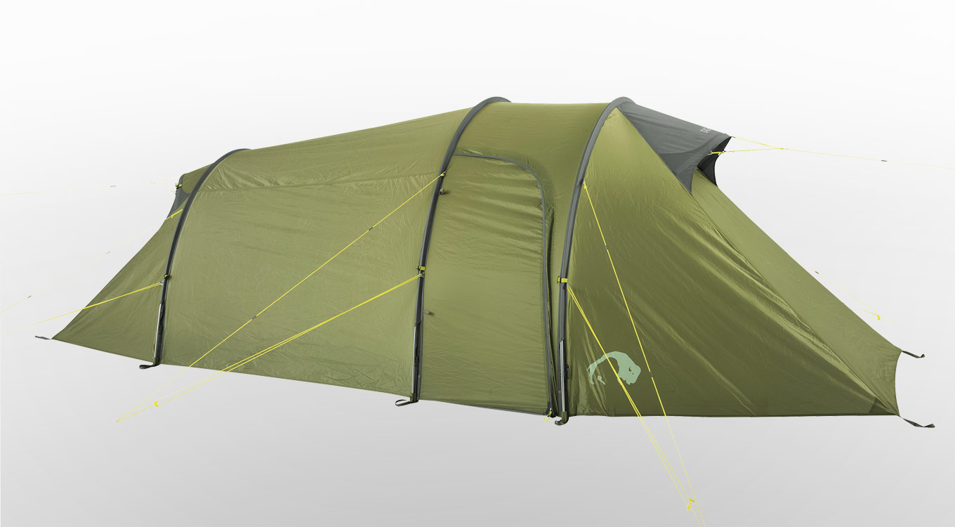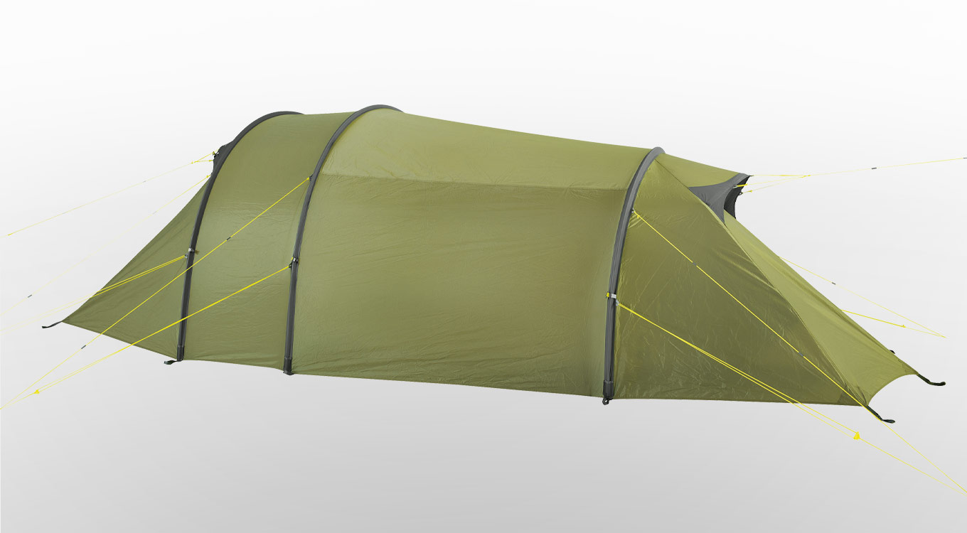 Die Grönland-Trekkingzelte bieten aufgrund der Konstruktion mit drei Gestängebögen eine große Apsis mit einem komfortablen Seiteneingang. Der kürzere Gestängebogen am Fußende des Zeltes spart Gewicht. Das gut belüftbare Grönland 3 Vent eignet sich besonders für warme Regionen.