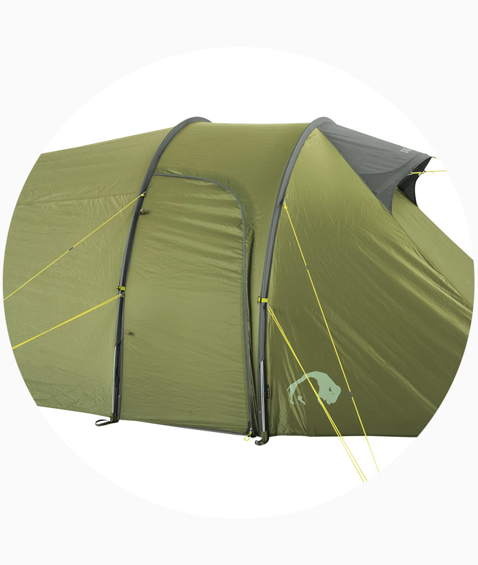 Die großzügige Apsis bietet viel Platz zum Verstauen der Ausrüstung. Der Seiteneingang ermöglicht bequemen Zutritt ins Zelt.
