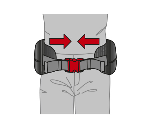 The middle of the hip strap should end around the hip bones. With the hip strap clasp facing out, tighten both sides of the hip strap towards your navel.