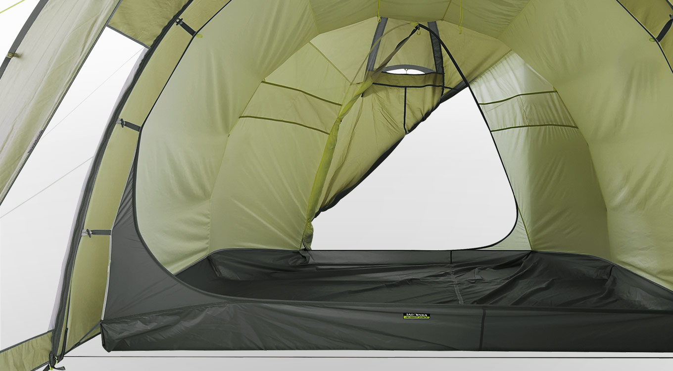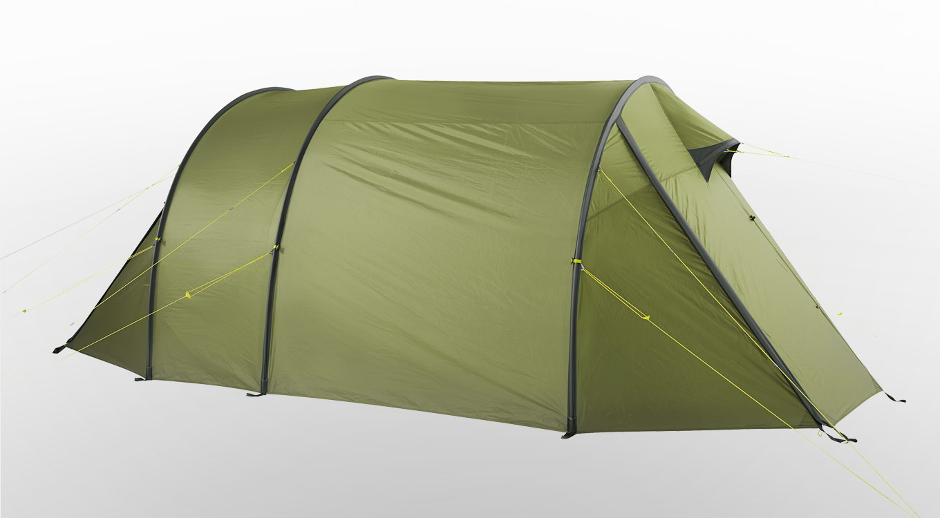 The DLX tunnel tents have a raised interior. This makes entering and staying in the tent very comfortable. Due to the construction with three or four tent poles, the tents have a large vestibule with side entrance on one side (Alaska 3 DLX) or a central vestibule with side entrance and two vestibules on the sides (Alaska Family DLX). Both tents have two front entrances as well.