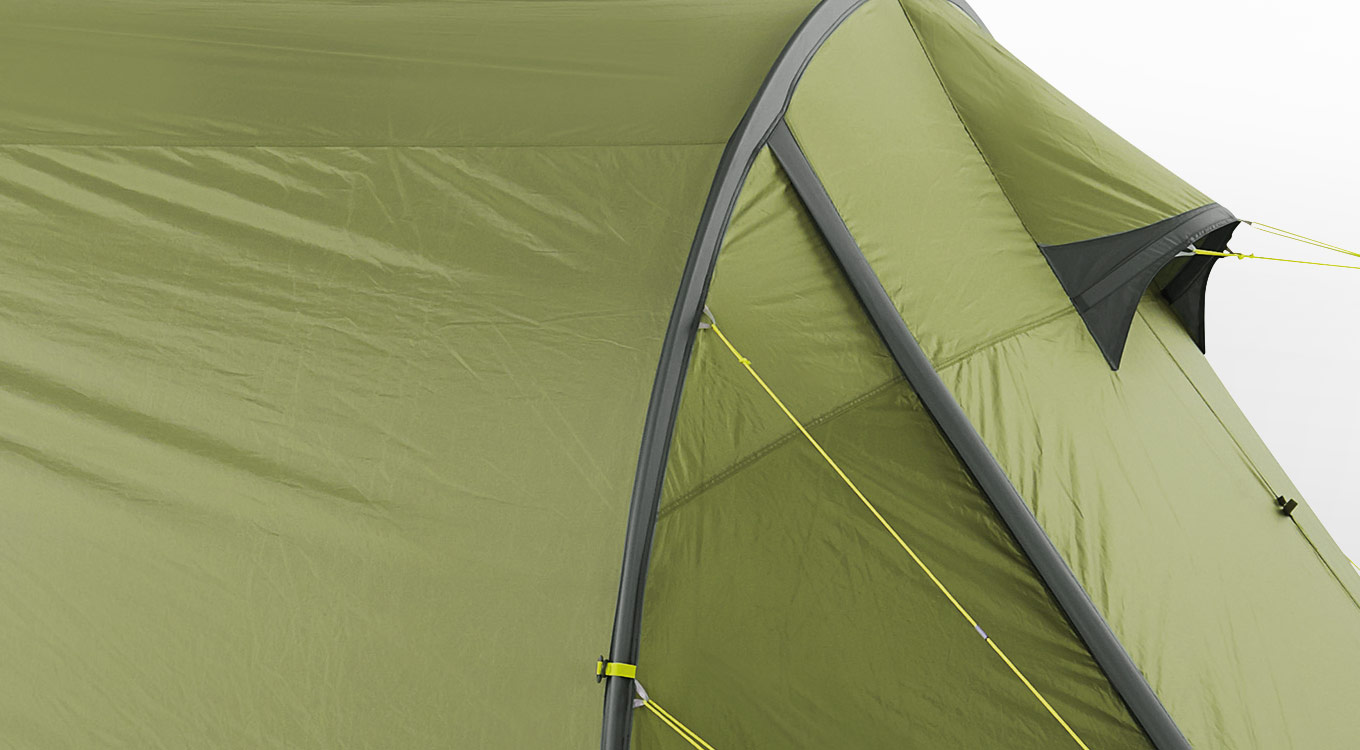 The spacious vestibule offers plenty of room for stowing equipment. The side entrance allows easy access into the tent. It can be closed with a separate mosquito net to protect against insects.