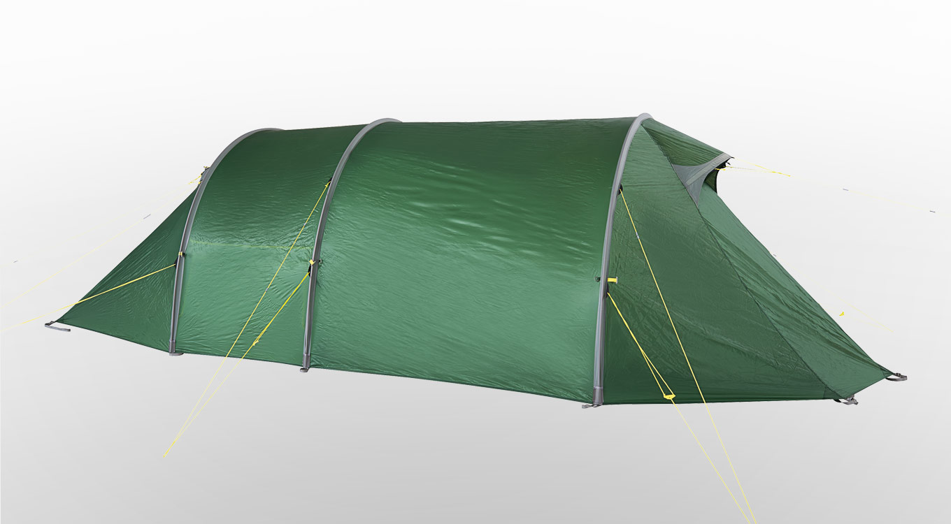The very lightweight trekking tent for three people offers a large vestibule due to the three pole arches. It has both a front and a side entrance into the vestibule.