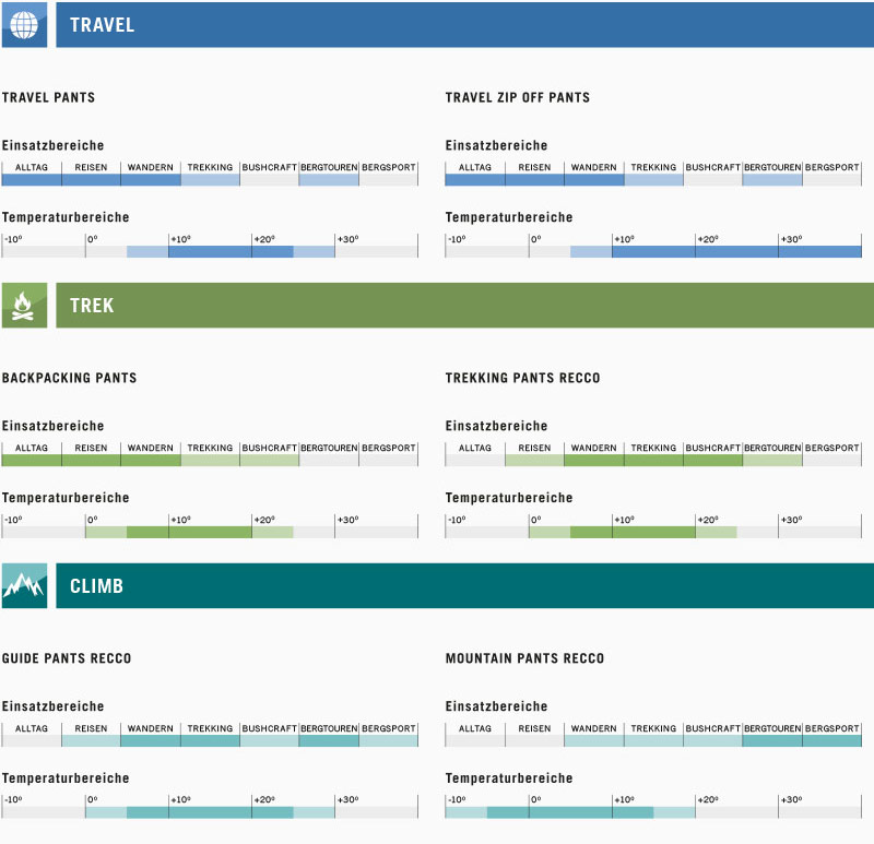 Kies de juiste broek voor uw gebruiksgebied. Gebruik de pictogrammen “Travel”, “Trek” en “Climb” als leidraad en volg de gedetailleerde aanbevelingen voor elke afzonderlijke broek.